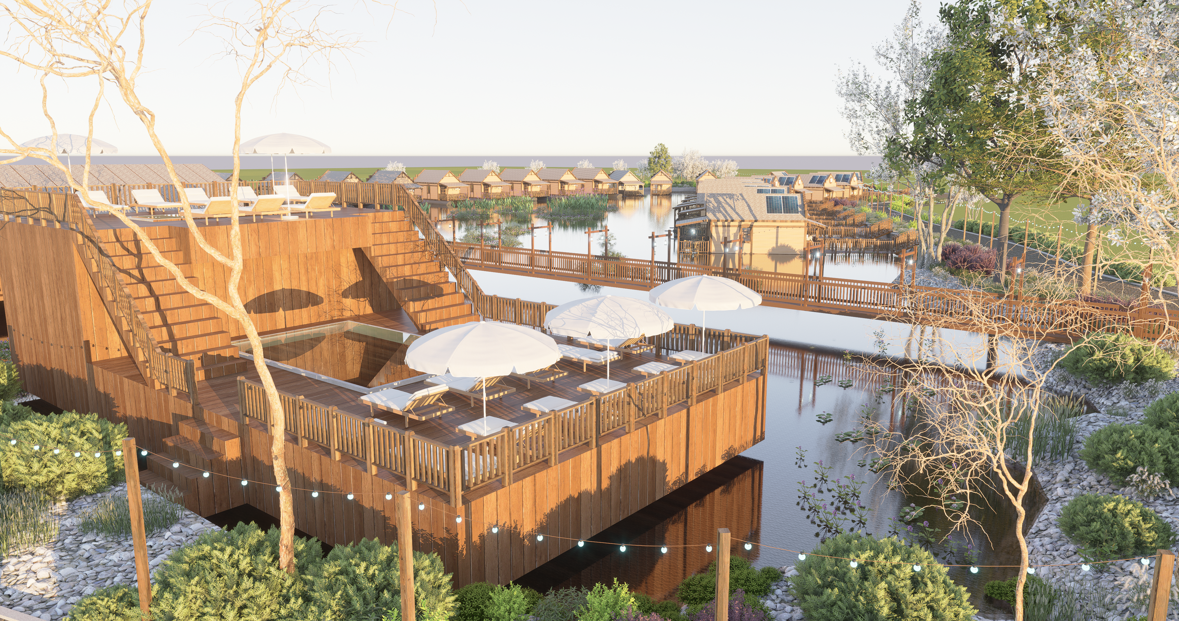 Projekt oprócz 24 w pełni niezależnych miejsc zakwaterowania nawiązujących do klimatu Dzikiego Zachodu, choć w zupełnie nowej odsłonie obejmuje także posadowienie na tafli stawu pływającego basenu oraz restauracji. Każda z tych atrakcji będzie złożona w głównej mierze z drewna, a obiekty do swojego funkcjonowania będą wykorzystywać odnawialne źródła energii, w tym pompa ciepła, która będzie podgrzewać wodę basenową przy pomocy ciepła odzyskanego z wody stawu. To nowoczesne podejście do wypoczynku, które łączy komfort z ekologią.